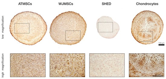 To more precisely investigate whether the ECM composition in the differentiated spheroids was indeed close to that of the hyaline cartilage, immunohistochemical staining for collagen II was performed on day 21 of differentiation (Figure 5). The results revealed significant accumulation of this cartilage-specific protein in ECM produced by chondrocytes, as well as ATMSCs. The strongest immune reaction appeared to be localized in the same regions of spheroid cross-sections where the most prominent collagen and GAG deposition was detected. Pronounced staining was also observed in the case of WJMSCs, but contrary to the chondrocyte and ATMSC spheroids, the chromogen was mainly bound to the cell cytoplasm rather than distributed in the extracellular space. This pattern might correspond to an earlier stage of chondrogenesis when synthesized collagen molecules have not been secreted yet. Among all the studied cell types, the SHED-based spheroids showed the lowest intensity of staining, which indicated an almost complete absence of collagen II, probably except minor traces visible in the cell cytoplasm.