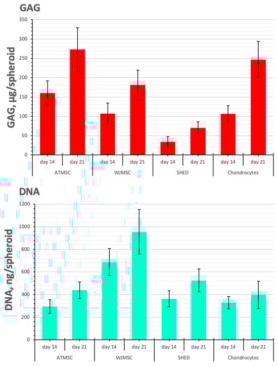 The DNA content, reflecting the cell proliferation rate, was similar between spheroids made of ATMSCs, SHEDs, and chondrocytes, but it was higher in the WJMSC spheroids (by 2.1–2.3 times and 1.8–2.4 times on day 14 and day 21 of culture with TGF-β1, respectively (p < 0.05)) (Figure 6). Note, that the amount of DNA and the diameter of the spheroids do not always conform (Figure 4). This is because the size of the spheroid depends not only on the number of cells, but also on the amount of ECM accumulated during chondrogenic differentiation.