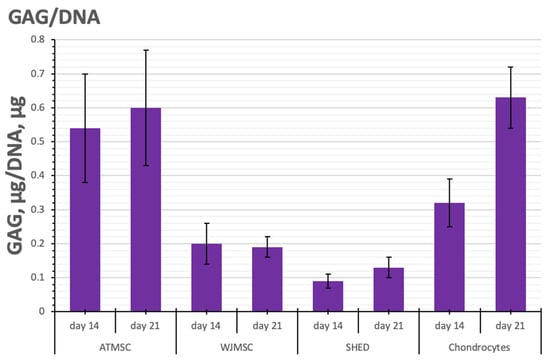 SHEDs produced fewer GAGs per spheroid than chondrocytes on all days of observation (p < 0.05). In contrast, in 21-day-old ATMSC spheroids and WJMSC spheroids, the GAG amount was 273.3 ± 56.1 and 181.0 ± 39.6 µg GAGs/spheroid, respectively, and did not significantly differ from that in chondrocyte spheroids (246.6 ± 47.3 µg GAGs/spheroid).