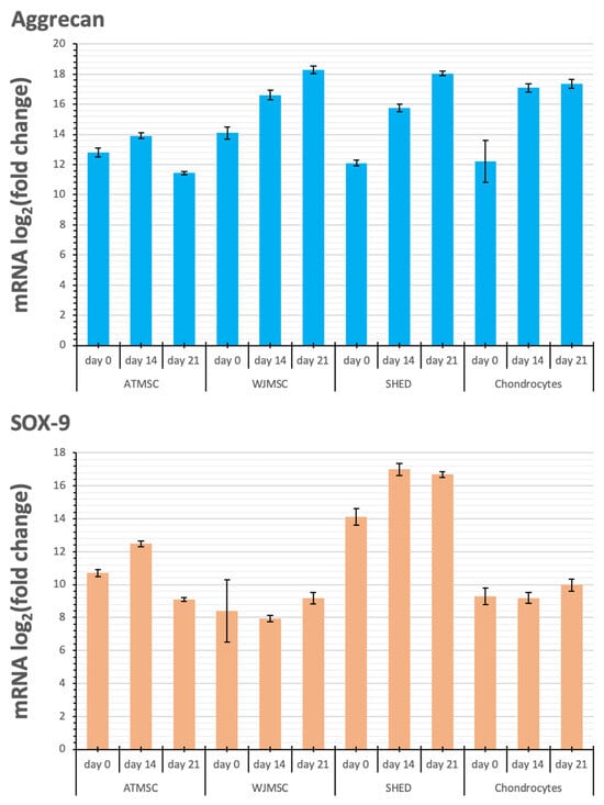 The level of transcription of Aggrecan, a cartilage proteoglycan, increased already on day 0 of cultivation with an inducer in each of the three-dimensional cultures, and also increased further, reaching a maximum on day 21. The expression of Sox-9, a transcription factor expressed at the early stage of chondrogenesis, showed a similar trend. The upregulation of both Aggrecan and Sox-9 expression is generally considered a confirmation of chondrogenic differentiation taking place in the 3D cultures [].