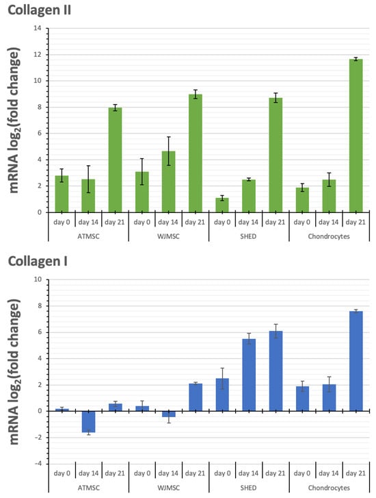 The comparison of the transcription level changes of Collagen II and Collagen I shows that along with the more potent Collagen II upregulation in ATMSC and WJMSC on day 0 and day 14, the transcription levels of Collagen I either changed within narrower limits (days 0 and 21 for WJMSC and day 0 for ATMSC) or even decreased (day 14 for ATMSC). In addition, the increase in collagen I transcription levels on day 21 for ATMSC and WJMSC was also less than for chondrocytes.