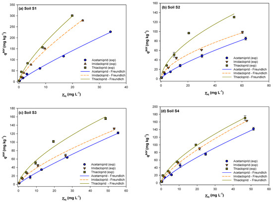 Freundlich isotherms for sorption of acetamiprid, imidacloprid, and thiacloprid in tested soils S1–S4 (a–d). Values are means ± standard deviations. Symbols and lines represent the experimental and theoretical curves represented by the Freundlich nonlinear equilibrium model, respectively.