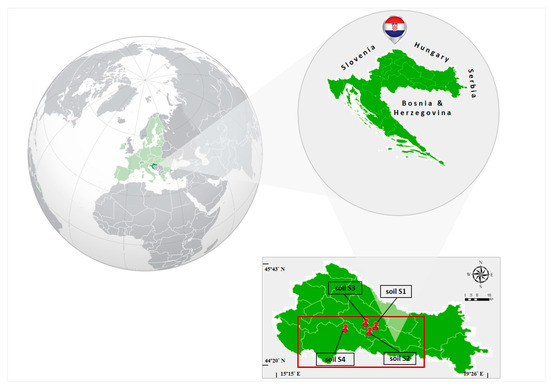 The field sites of this experiment were situated in two agricultural Croatian counties: Požega-Slavonia (the area around the cities of Lipik and Pakrac) and Sisak-Moslavina (the area around the city of Kutina). Topsoil samples were collected according to a Standard Sampling Procedure [86] on 0.5 ha (~50 × 100 m) from the four localities (soil S1—forest soil, city of Pakrac; soil S2—sediment soil from lake Raminac, city of Lipik; soil S3—agricultural soil, city of Pakrac; and soil S4—agricultural soil, city of Kutina) at depths of 0–30 cm using a stainless steel probe. Geographic Coordinate Systems (GCSs) of each sampling location are given in Table 2, while their positions on the geographic map are shown in Figure 5.