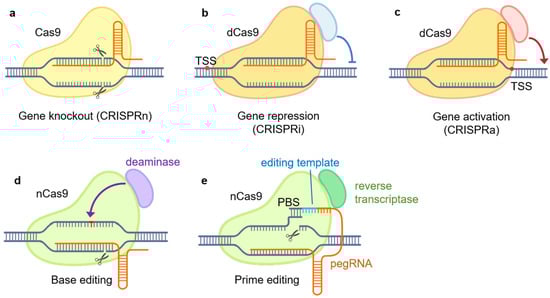 - Anzalone, A.V.; Koblan, L.W.; Liu, D.R. Genome editing with CRISPR–Cas nucleases, base editors, transposases and prime editors. Nat. Biotechnol. 2020, 38, 824–844. [Google Scholar] [CrossRef] [PubMed]