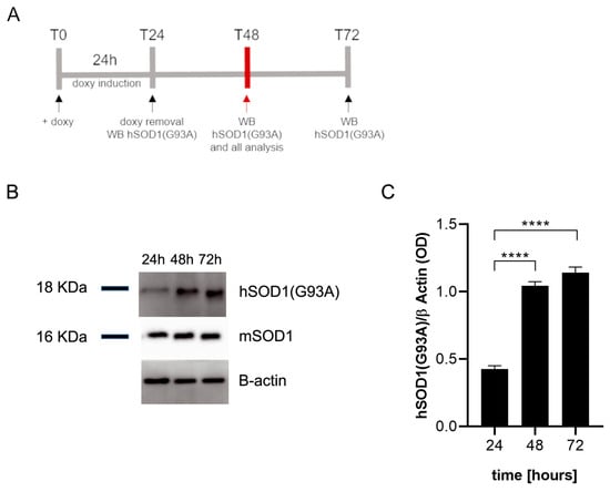Western blot analysis of SIM-A9hSOD1(G93A) microglial cells. (A) Schematic illustration of the experimental timeline: T0, doxycycline has been added to the culture medium; T24, doxycycline has been removed from the culture medium and hSOD1(G93A) was detected; T48 hSOD1(G93A) was detected 24 h after doxycycline removal, T72 hSOD1(G93A) was detected 48 h after doxycycline removal. (B) The representative Western blot performed on microglial cells to detect the expression of hSOD1(G93A) at 24, 48, and 72 h after doxycycline (doxy) addition. (C) The semi-quantitative analysis of hSOD1(G93A) expression revealed high levels of protein after the incubation with doxycycline. Data are shown as mean ± SEM; one-way ANOVA with Tukey’s post hoc correction; **** p < 0.0001.