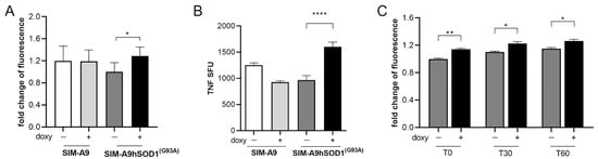 We then evaluated the release of reactive oxygen species (ROS) by SIM-A9hSOD1(G93A) cells, which is known to be one of the cellular mechanisms implicated in the pathogenesis of ALS. An ROS-sensitive probe (CM-H2DCFDA) was used to analyze ROS production by the SIM-A9hSOD1(G93A) cells (n = 6 replicates for each condition). Our results showed that doxycycline-treated SIM-A9hSOD1(G93A) cells displayed higher levels of ROS compared to untreated SIM-A9hSOD1(G93A) cells. In particular, we found increased fluorescence intensity of the ROS-sensitive probe (CM-H2DCFDA) immediately after incubation with the dye (T0 p = 0.0011), as well as after 30 (T30 p = 0.03401) and 60 min (T60 p = 0.0280; Figure 2C). These results indicate that the induction of the hSOD1(G93A) gene by doxycycline enhanced the ROS production by SIM-A9hSOD1(G93A) cells.