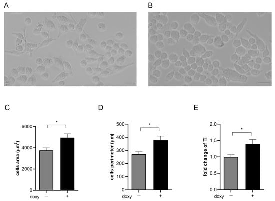 Morphological analysis of SIM-A9hSOD1(G93A) microglial cells. Representative images of untreated microglial SIM-A9hSOD1(G93A) cells (A) and following incubation with doxycycline (doxy+) (B). Graphs show the quantitative analysis of cells’ morphology parameters, namely cell body area (3757.53 ± 717.21 vs. 4961.03 ± 1099.24 μm2) (C), cell perimeter (272.15 ± 51.33 vs. 377.68 ± 96.67 μm) (D) and transformation index (1.572 ± 0.31 vs. 2.318 ± 0.8) (E). Magnification 10×, scale bar 100 μm. Significant differences indicated as * p < 0.05 were assessed via the Student’s T test. Data are shown as mean ± SEM.