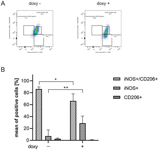 Flow cytometry analysis was performed to verify if hSOD1(G93A) expression could promote a pro-inflammatory phenotype in microglial cells. In particular, the inflammatory phenotype was ascertained in SIM-A9hSOD1(G93A) cells in terms of the expression of M1 pro-inflammatory (INOS) or M2 anti-inflammatory (CD206 Mannose Receptor-positive) markers (n = 3 replicates for each condition). The analysis revealed that SIM-A9hSOD1(G93A) cells, in the absence of doxycycline treatment, do not show a specific M1 or M2 phenotype, with the majority remaining undifferentiated (86.27%). Indeed, the percentages of INOS-positive and CD206-positive cells remained very low (7.13% and 2.65%, respectively) (Figure 4A,B). Interestingly, doxycycline treatment of SIM-A9hSOD1(G93A) cells induced a significant increase in INOS-positive compared to CD-206 positive cells (18.11% and 0.81%, respectively) and a reduction in undifferentiated cells (76.75%) (Figure 4A,B). Thus, the presence of the hSOD1(G93A) protein was able to reduce the undifferentiated phenotype (p = 0.0180; * p < 0.05) and to drive SIM-A9hSOD1(G93A) cells versus an M1 pro-inflammatory phenotype (p = 0.0091; ** p < 0.01) (Figure 4B), also observed and quantified by immunofluorescence staining (Supplementary Figure S2).
