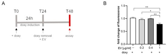 The WST assay on SIM-A9hSOD1(G93A) cells treated with ASC-EV. (A) Experimental timeline of SIM-A9hSOD1(G93A) cells’ treatment with ASC-EV. (B) Metabolic activity of microglial SIM-A9hSOD1(G93A) cells treated with 0, 0.2, 0.4, and 1 µg/mL of ASC-EV for 24 h. Significant differences indicated as * p < 0.05 and ** p < 0.01 were assessed via one-way ANOVA with Tukey’s post hoc correction. Data are shown as mean ± SEM.
