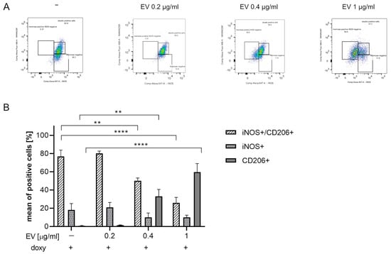 The percentage of INOS+/CD206+ double-positive cells significantly decreased in a dose-dependent manner and in particular after incubation with 1 µg/mL ASC-EVs (p < 0.0001). Interestingly, a concomitant increase in the percentage of CD206+ cells (p < 0.0001) was detected (Figure 6B) (n = 3 replicates for each condition).