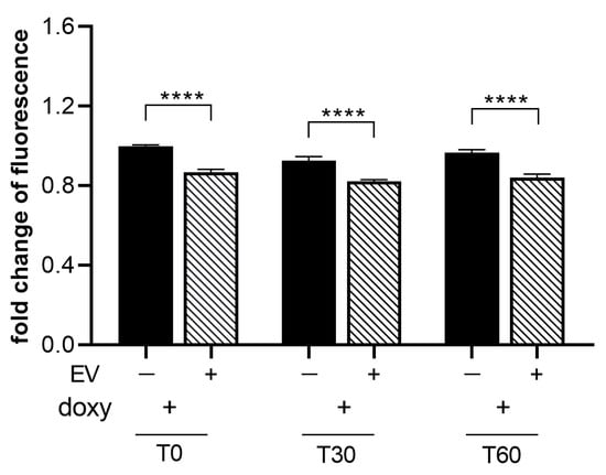 To assess the effect of ASC-EVs in modulating ROS release by activated SIM-A9hSOD1(G93A) cells, we treated microglial cells with 1 µg/mL ASC-EVs (the concentration observed to be more effective in inducing phenotypical changes in SIM-A9hSOD1(G93A) cells) (n = 6 replicates for each condition). We observed a ~15% reduction in CMH2DCFDA fluorescence intensity at different time points after incubation with the dye, indicating that the ASC-EV treatment was able to significantly decrease the production of ROS in SIM-A9hSOD1(G93A) cells (Figure 7).