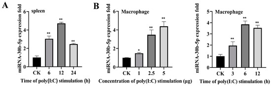 In order to investigate miRNAs involved in the silver carp’s antiviral defense mechanism, we examined the miRNA expression profile in silver carp spleen tissue following poly (I:C) stimulation. Deep sequencing analysis revealed a differential expression of several miRNAs, among which miR-30b-5p showed a significant increase upon poly (I:C) stimulation (Figure S1). The expression pattern of miR-30b-5p in vivo and in vitro was further verified by RT-qPCR. As shown in Figure 1A,B, the expression of miR-30b-5p was up-regulated in the poly (I:C)-stimulated spleen and HKCs compared with the control group CK. These findings suggest that miR-30b-5p may play a role in regulating the immune response triggered by poly (I:C).