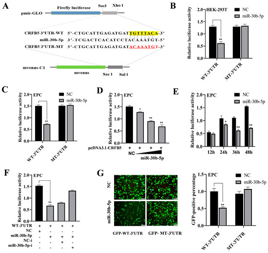 miR-30b-5p targets silver carp CRFB5. (A) Schematic diagram illustrating miR-30b-5p target site prediction in CRFB5 3′UTR and the process of constructing reporter plasmid; The yellow shadow region: the binding sites; The red characters: the mutation sites. (B,C) Co-transfection of HEK-293T cells (B) or EPC cells (C) was performed using either WT-3′UTR or MT-3′UTR reporter plasmids along with miR-30b-5p or NC, and luciferase activity was assessed 48 h post transfection. (D,E) Co-transfection of EPC cells was carried out with WT-3′UTR, along with miR-30b-5p or NC in a concentration (D) and time gradient (E) manner, and luciferase activity was assessed post transfection. (F) Luciferase activity was evaluated 48 h after the co-transfection of WT-3′UTR and miR-30b-5p with miR-30b-5p inhibitor (miR-30b-5p-i) or negative control inhibitor (NC-i) in EPC cells. (G) GFP-WT-3′UTR or GFP-MT-3′UTR was co-transfected with NC or miR-30b-5p in EPC cells; scale bars: 50 μm. Fluorescence intensity was measured 48 h post transfection. Data are presented as the means ± SD (n = 3). Significance is shown as *, p < 0.05; **, p < 0.01 in comparison to the controls.