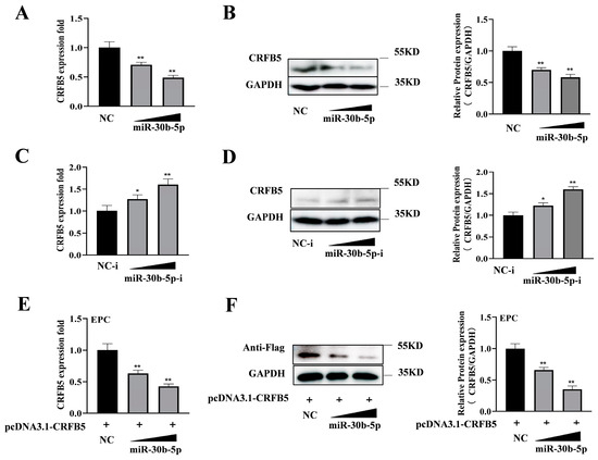 MiRNAs may down-regulate target gene expression through mRNA degradation or the inhibition of translation, so miR-30b-5p was investigated for its role in regulating CRFB5 expression. As shown in Figure 4A,B, the transfection of miR-30b-5p into silver carp HKCs resulted in a dose-dependent reduction in CRFB5 mRNA and protein levels, whereas the transfection of miR-30b-5p inhibitors led to an increase in CRFB5 expression (Figure 4C,D). Furthermore, co-transfection of the CRFB5 full-length plasmid with miR-30b-5p into EPC cells also resulted in a reduced CRFB5 expression (Figure 4E,F). These findings suggest that miR-30b-5p directly targets and suppresses the post-transcriptional expression of CRFB5.