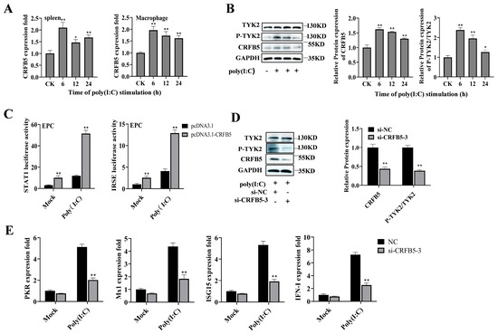 CRFB5 involvement in the poly (I:C)-induced immune response via the JAK/STAT signaling pathway. (A) Expression profile of CRFB5 in silver carp spleen (A) and HKCs (B) stimulated by poly (I:C). (B) Poly (I:C) stimulated HKCs in a time gradient manner, and the expression levels of CRFB5 and phosphorylated P-TYK2 were detected by Western blotting. (C) After the co-transfection of EPC cells with the full-length expression plasmid pCDNA3.1-CRFB5 or the negative control pCDNA3.1, along with the IRSE luciferin reporter plasmid or STAT1 at 48 h, poly (I:C) was used to activate the cells for 6 h. Luciferase activity was measured. (D,E) Silver carp HKCs were transfected with si-CRFB5-3 or si-NC for 48 h. The cells were then stimulated for 6 h with poly (I:C). Protein expression levels of CRFB5 and P-TYK2 were detected by Western blotting (D), while the expression of antiviral genes (PKR, MX1, ISG15, and IFN-I) was detected by RT-qPCR (E). The data are presented as mean ± SD (n = 3). Significance is shown as *, p < 0.05; **, p < 0.01 in comparison to the controls.