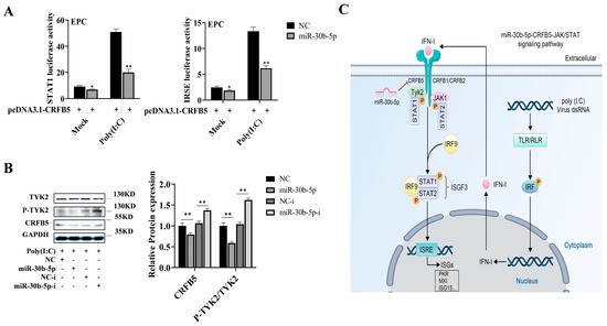In view of the above findings, miR-30b-5p can regulate the expression of the antiviral genes, and miR-30b-5p can target CRFB5, which participates in the innate immunity induced by poly (I:C) through the JAK/STAT pathway. Thus, we looked into the possibility of a regulatory mechanism for miR-30b-5p on the CRFB5-mediated JAK/STAT signal pathway. As presented in Figure 6A, miR-30b-5p significantly suppressed the CRFB5-induced activation of STAT1 and ISRE, especially following poly (I:C) stimulation. Additionally, miR-30b-5p down-regulated the expression of CRFB5 and P-TYK2, while miR-30b-5p-i had the opposite effect (Figure 6B). These results unequivocally demonstrate that miR-30b-5p negatively regulates the CRFB5-mediated JAK/STAT signaling pathway in response to poly (I:C) stimulation (Figure 6C).