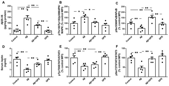 2.2. GPE Partially Counteracts the Inhibitory Effects of Aβ25-35 on the Activation of Leptin Signaling