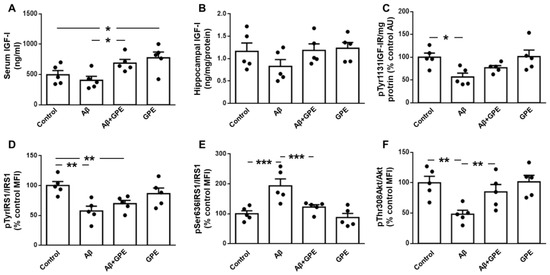 Effects of Aβ25-35 (300 pmol/day) and GPE co-administration on IGF-I levels and IGF-I-related signaling targets. Serum (A,B) and hippocampal levels of insulin-like growth factor-I (IGF-I) and relative protein levels of (C) IGF-I receptor (IGF-IR) phosphorylated at Tyr1131 (pTyr1131IGF-IR), (D) insulin receptor substrate 1 (IRS1) phosphorylated at Tyr residues (pTyrIRS1), (E) IRS1 phosphorylated at Ser636 (pSer636IRS1), and (F) Akt phosphorylated at Thr308 (pThr308Akt) in ovariectomized (Ovx) rats (control), Ovx rats treated with β-amyloid 25-35 peptide (Aβ), Ovx rats treated with Aβ25-35 plus GPE (Aβ + GPE), and Ovx rats treated with GPE (GPE). Data are expressed as mean ± SEM. N = 5. AU, absorbance units, MFI, median fluorescent intensity * p < 0.05, ** p < 0.01, *** p < 0.001.