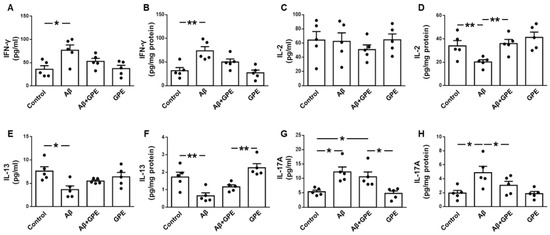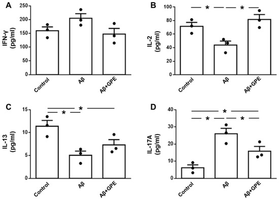Levels of IFN-γ in culture media were unaffected by Aβ-25-35 or GPE co-administration (Figure 7A). Aβ25-35 induced a reduction in IL-2 levels that was prevented by the co-administration of GPE (Figure 7B). Concentrations of IL-13 were reduced after the addition of Aβ25-35, and GPE had no effect (Figure 7C). Aβ-25-35 augmented IL-17A levels, and GPE co-administration partially prevented these changes (Figure 7D).
