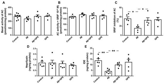2.5. Aβ25-35 and GPE Are Involved in Modulating the Activity of AC and the Levels of an Aβ-Degrading Enzyme