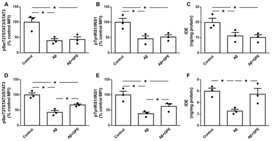 Aβ25-35 decreased the phosphorylation of STAT3 and IRS1 and IDE levels in glial cells (Figure 6D–F, respectively). The co-administration of GPE partially prevented changes in STAT3 and IRS1 phosphorylation (Figure 6D–E) and fully prevented Aβ25-35-induced IDE reduction (Figure 6F).