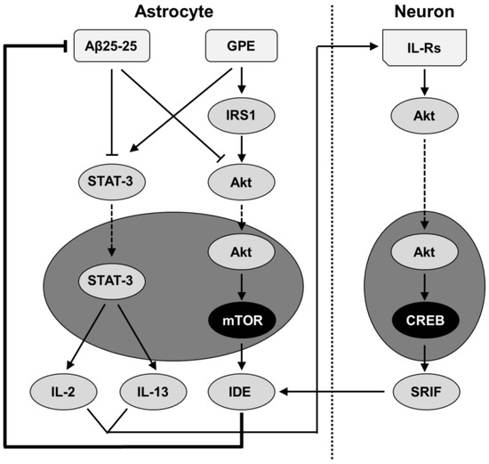 GPE and its analogues have anti-inflammatory properties, which is one of their most important effects, since inflammation favors aggregation processes and decreases the efficiency of glial cells in the processes of the clearance of Aβ aggregates [6]. In this sense, IGF-I is involved in Aβ clearance [17] and also activates the Akt pathway, as does GPE [18]. A decrease in IGF-I sensitivity increases Aβ toxicity, while the activation of its intracellular pathway is associated with an increase in the synthesis and activity of Aβ-degrading enzymes [19], such as insulin-degrading enzyme (IDE).