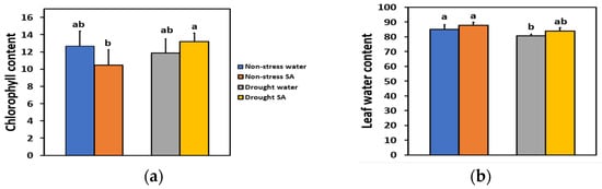 2.1. Chlorophyll Content and Leaf Water Content under Non-Stress or Mild Drought Stress with or without Salicylic Acid