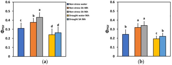 The effective quantum yield of PSII photochemistry (ΦPSII) at 200 μmol photons m−2 s−1 (LL) (a) or 900 μmol photons m−2 s−1 (HL) (b) of basil plants, under non-stressed control conditions (water sprayed), and 48 h and 96 h after the spray with 1 mM SA, or 96 h after withholding the irrigation on the water-sprayed or SA-sprayed plants. Error bars are standard deviations (SD). Different lowercase letters express significant difference.