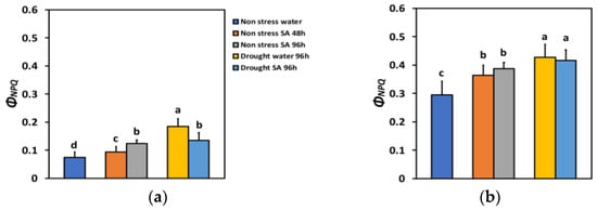 The quantum yield of regulated non-photochemical energy loss in PSII (ΦNPQ) at 200 μmol photons m−2 s−1 (LL) (a) or 900 μmol photons m−2 s−1 (HL) (b) of basil plants, under non-stressed control conditions (water sprayed), and 48 h and 96 h after the spray with 1 mM SA, or 96 h after withholding the irrigation on the water-sprayed or SA-sprayed plants. Error bars are standard deviations (SD). Different lowercase letters express significant difference.