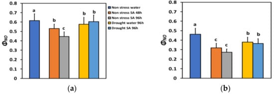The quantum yield of non-regulated energy loss in PSII (ΦNO) under NS conditions and LL decreased after 48 h of SA spraying by 14% and after 96 h of SA spraying by 28% (Figure 4a), while under HL, it decreased more (−31% after 48 h and −41% after 96 h of SA spraying) (Figure 4b). However, under HL, there was not any significant difference between the two time periods (Figure 4b).