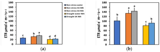 The electron transport rate (ETR) at 200 μmol photons m−2 s−1 (LL) (a) or 900 μmol photons m−2 s−1 (HL) (b) of basil plants, under non-stressed control conditions (water sprayed), and 48 h and 96 h after the spray with 1 mM SA, or 96 h after withholding the irrigation on the water-sprayed or SA-sprayed plants. Error bars are standard deviations (SD). Different lowercase letters express significant difference.