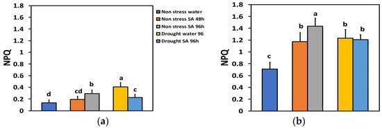 The non-photochemical quenching (NPQ) at 200 μmol photons m−2 s−1 (LL) (a) or 900 μmol photons m−2 s−1 (HL) (b) of basil plants, under non-stressed control conditions (water sprayed), and 48 h and 96 h after the spray with 1 mM SA, or 96 h after withholding the irrigation on the water-sprayed or SA-sprayed plants. Error bars are standard deviations (SD). Different lowercase letters express significant difference.