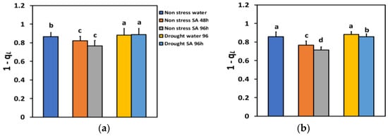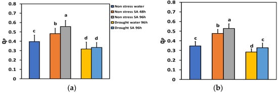 The fraction of open reaction centers of PSII (qp) at 200 μmol photons m−2 s−1 (LL) (a) or 900 μmol photons m−2 s−1 (HL) (b) of basil plants, under non-stressed control conditions (water sprayed), and 48 h and 96 h after the spray with 1 mM SA, or 96 h after withholding the irrigation on the water-sprayed or SA-sprayed plants. Error bars are standard deviations (SD). Different lowercase letters express significant difference.