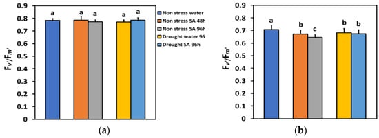 The efficiency of the open reaction centers of PSII (Fv’/Fm’) at 200 μmol photons m−2 s−1 (LL) (a) or 900 μmol photons m−2 s−1 (HL) (b) of basil plants, under non-stressed control conditions (water sprayed), and 48 h and 96 h after the spray with 1 mM SA, or 96 h after withholding the irrigation on the water-sprayed or SA-sprayed plants. Error bars are standard deviations (SD). Different lowercase letters express significant difference.
