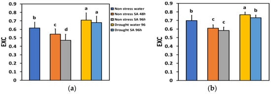 The excess excitation energy at PSII (EXC) at 200 μmol photons m−2 s−1 (LL) (a) or 900 μmol photons m−2 s−1 (HL) (b) of basil plants, under non-stressed control conditions (water sprayed), and 48 h and 96 h after the spray with 1 mM SA, or 96 h after withholding the irrigation on the water-sprayed or SA-sprayed plants. Error bars are standard deviations (SD). Different lowercase letters express significant difference.