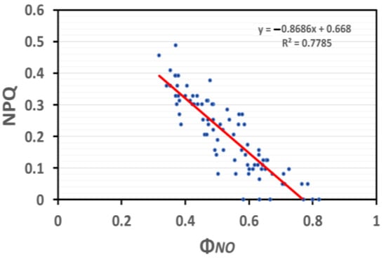 Correlation analysis between NPQ and ΦNO of basil plants under NS conditions and LL (based on data of Figure 4a and Figure 6a, respectively). Each blue dot represents the paired measurement of the variables, while the red line is the regression line that shows the relationship between the two variables.