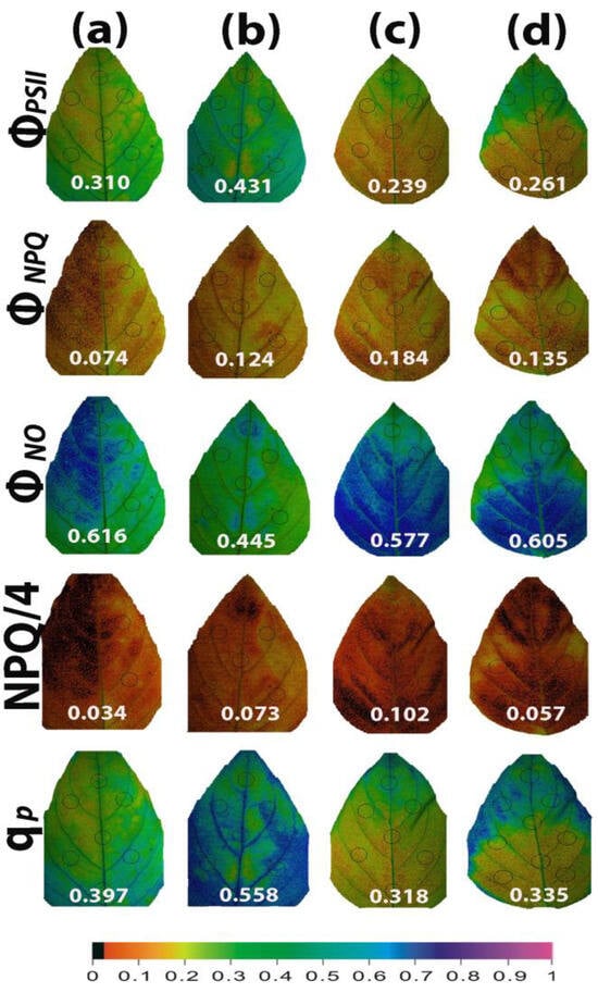 Illustrative color-coded whole leaf images of the functional PSII heterogeneity of the parameters ΦPSII, ΦNPQ, ΦNO, NPQ/4, and qp, evaluated at 200 μmol photons m−2 s−1, under non-stressed control conditions (water sprayed) (a), 96 h after the spray with 1 mM SA (b), after withholding the irrigation for 96 h on the water-sprayed plants (c), or after withholding the irrigation for 96 h on the SA-sprayed plants (d). A color code at the bottom, indicating the corresponding parameter values along the whole leaf area as well as the average whole leaf value, is provided.