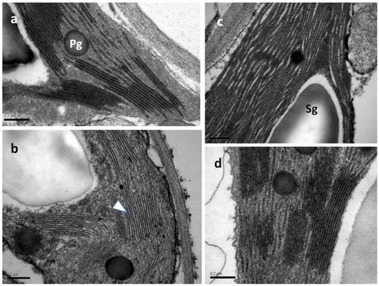 In all samples observed by transmission electron microscopy (TEM), the chloroplasts exhibited integral plastid envelopes, well-developed frets and grana thylakoids, plastoglobuli, and starch grains (Figure 13). In both water-sprayed and SA-sprayed NS leaves (Figure 13a,c), as well as in SA-sprayed MiDS leaves (Figure 13d), thylakoids were tightly packed with a prominent electron-dense content. On the contrary, in chloroplasts of water-sprayed MiDS leaves, the thylakoids appeared slightly dilated, including electron-transparent content (Figure 13b).