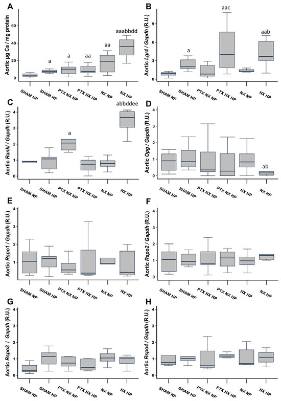 Aortic gene expression of Lgr4 was significantly higher in all groups of rats fed an HP diet (Figure 1B). Aortic gene expression of Rankl significantly increased in the PTX NX NP and NX HP groups, with the greatest increase observed in the latter (Figure 1C). Furthermore, the NX HP group was the only group that exhibited a reduction in aortic Opg gene expression, although this reduction reached significance only when compared to the two Sham groups (Figure 1D). Finally, aortic gene expression of the Lgr4 ligands, Rspos (Rspos1, 2, 3, and 4), did not show any significant change (Figure 1E–H).
