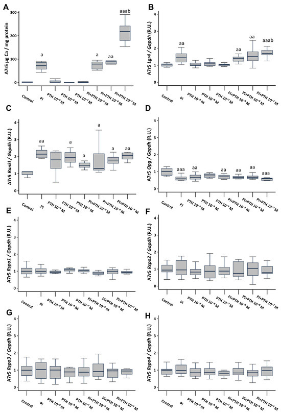 Effect of high phosphate (Pi) (3 mM) and different PTH concentrations (10−9, 10−8, and 10−7 M) on A7r5 vascular smooth muscle cells after 4 days of exposure. Ca content was determined by the o-cresolphtalein complexone method (A). Gene expression was evaluated by qRT-PCR for Lgr4 (B), Rankl (C), Opg (D), Rspo1 (E), Rspo2 (F), Rspo3 (G) and Rspo4 (H). Data are presented as median [interquartile range]. R.U., relative units. a p < 0.05, aa p < 0.01, aaa p < 0.001 versus control (non-calcifying medium, 1 mM phosphate); b p < 0.05 versus Pi.