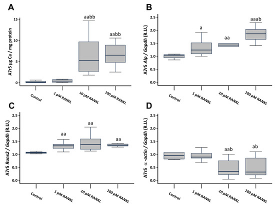 Effect of different soluble RANKL concentrations (1, 10, and 100 pM) on A7r5 vascular smooth muscle cells after 4 days of exposure in non-calcifying medium (1 mM phosphate). Ca content determined by o-cresolphtalein complexone method (A). Gene expression was evaluated by qRT-PCR for Alp (B), Runx2 (C), and α-actin (D). Data are presented as median [interquartile range]. R.U., relative units. a p < 0.05, aa p < 0.01, aaa p < 0.001 versus control (non-calcifying medium, 1 mM phosphate); b p < 0.05, bb p < 0.01, versus non-calcifying medium (1 mM phosphate) + 1 pM RANKL.