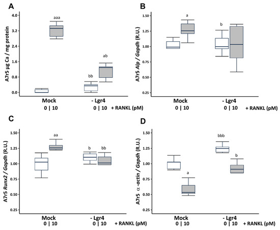 Effect of Lgr4 silencing on A7r5 vascular smooth muscle cells exposed to soluble RANKL (10 pM) in non-calcifying medium (1 mM phosphate). Ca content was determined by the o-cresolphtalein complexone method (A). Gene expression was evaluated by qRT-PCR for Alp (B), Runx2 (C), and α-actin (D). White and grey boxes represent the non-addition of RANKL and the addition of 10 pM of RANKL, respectively. Data are presented as median [interquartile range]. R.U., relative units. Mock, scramble transfection control of silencing. a p < 0.05, aa p < 0.01, aaa p < 0.001 versus Mock (0 pM RANKL); b p < 0.05, bb p < 0.01, bbb p < 0.001 versus Mock + 10 pM RANKL.