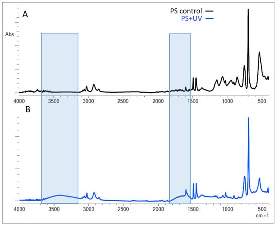 FTIR spectra of pristine (A) and artificial aging (B) polystyrene microgranules for 120 h with UV irradiation. Blue rectangles indicate the areas of spectra with the largest changes.