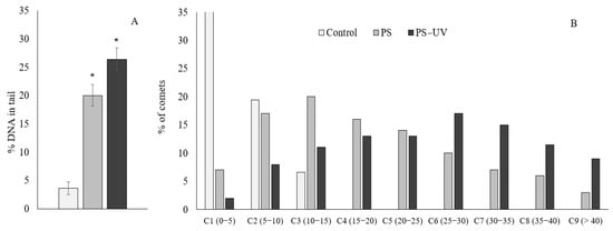 A similar trend was observed when the cytochemical test using neutral red dye was used (Figure 2B). The results show that hemocytes from the experimental groups of mussels have a significantly decreased ability to retain the dye, indicating destabilization of lysosome membranes induced by uptake of both types of µPS. As in the case of the resazurin test, UV-irradiated PS microgranules had a greater destabilizing effect on lysosome membranes compared to pristine µPS. To assess the level of destructive processes in the genome of hemocytes of control and experimental mollusks after exposure to both types of microplastic, we applied the DNA comet assay, which allows us to evaluate this parameter in individual cells. Figure 3A shows one of the quantitative parameters of the obtained comets (average values of % of DNA migrating in the electric field to the “tail” of the comet), which characterizes the level of damage of the DNA molecule.
