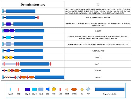 | SerP55 Tequila | CBM (3), LDL (3), SRCR (2) PAN | H | D | S | D | G | G | Trypsin | 5 | 10 | 25 | 51 | 58 | 46 | 40 |