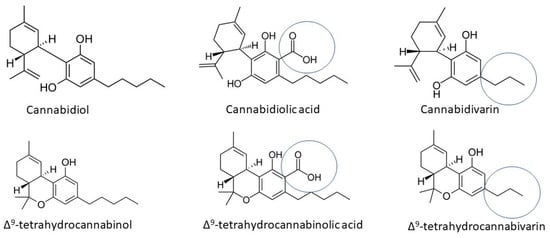 Cannabinoids can be broadly categorized into acidic, neutral, and varinic forms (Figure 1) [44]. Acidic cannabinoids, like cannabidiolic acid (CBDA) and tetrahydrocannabinolic acid (THCA), are the precursor forms found in the plant, which undergo decarboxylation to convert into their neutral counterparts upon heating or aging [45]. These acidic forms are typically found in raw cannabis plants and are less potent than their neutral counterparts. Neutral cannabinoids, such as cannabidiol (CBD) and Δ9-tetrahydrocannabinol (THC), are commonly known forms that interact with cannabinoid receptors in the human body, primarily CB1 and CB2 receptors, exerting various effects [46]. Varinic cannabinoids like tetrahydrocannabivarin (THCV) and cannabidivarin (CBDV) possess distinctive structures with specific alkyl side chains, setting them apart from other cannabinoids found in Cannabis sativa [47,48]. These structural differences influence their interactions with cannabinoid receptors and contribute to their pharmacological properties.