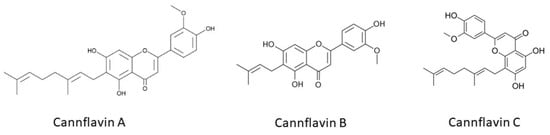Polyphenols in cannabis include flavonoids, phenolic acids, and lignans, and they are known for their antioxidant, anti-inflammatory, and neuroprotective effects [54]. The flavonoid profile of cannabis extracts comprises flavones (apigenin and luteolin), flavonols (kaempferol and quercetin), aglycones, and glycosides [56]. Cannabis plants also have unique compounds, such as cannflavins, which are specific to the plant (Figure 3) [57]. These compounds, including cannflavin A, cannflavin B, and cannflavin C, have been studied for their diverse biological activities, particularly their anti-inflammatory and anticancer effects [58]. In addition to their anti-inflammatory effects, cannflavins have also demonstrated anticancer potential. Studies have highlighted the ability of cannflavins to inhibit the growth of cancer cells and induce apoptosis, suggesting their potential as novel anticancer agents [59].