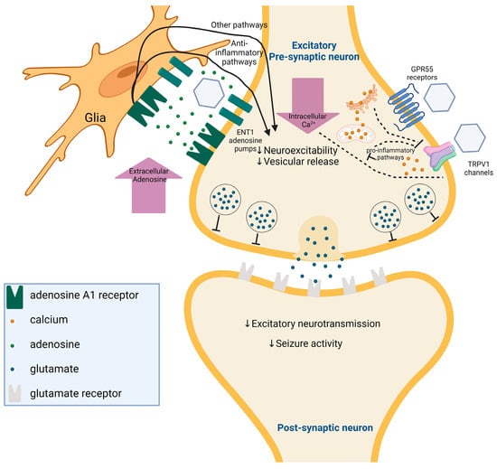 The mechanism of action of CBD in epilepsy involves its interaction with multiple molecular targets (Figure 5), including GPR55, TRPV1, and the adenosine system [105]. CBD has been shown to antagonize GPR55 receptor activation [106]. GPR55’s involvement in modulating neuronal excitability is underscored by its increased expression in the epileptic hippocampus [107]. Functional antagonism of GPR55 by CBD reduces neuronal excitability, contributing to its anticonvulsive effects. TRPV1 channels are expressed widely in the central nervous system and play a role in promoting neuronal depolarization [108]. CBD activates and rapidly desensitizes TRPV1 receptors, leading to a decrease in synaptic activity and neuronal firing rate [109,110]. Increased TRPV1 expression in epilepsy suggests its involvement in regulating cortical excitability [111,112,113]. The anticonvulsive action of CBD involves TRPV1, as demonstrated by CBD’s blunted response in TRPV1 knock-out mice [114]. Adenosine is an endogenous modulator of neuronal excitability and plays a crucial role in terminating seizures [115]. CBD enhances adenosine-mediated signaling by increasing extracellular adenosine levels through inhibition of adenosine reuptake. Adenosine exerts its anticonvulsant effects primarily through activation of A1 receptors, leading to presynaptic calcium influx inhibition and postsynaptic hyperpolarization [116]. Adenosine further fine-tunes neuromodulation by engaging in heterodimerization with other G-protein-coupled receptors [117]. This interaction extends adenosine’s influence across various neurotransmitter and neurotrophin systems. CBD’s modulation of adenosine transport contributes to its anticonvulsive properties, enhancing adenosine’s inhibitory effects on excitatory transmission. While the precise mechanism of action of CBD in humans is not fully understood, preclinical evidence strongly implicates GPR55 antagonism, TRPV1 desensitization, and adenosine modulation in CBD’s anticonvulsive effects. These mechanisms collectively reduce neuronal excitability and modulate neurotransmitter release, leading to the suppression of seizure activity Further research is needed to elucidate additional targets and pathways involved in CBD’s therapeutic action against epilepsy.