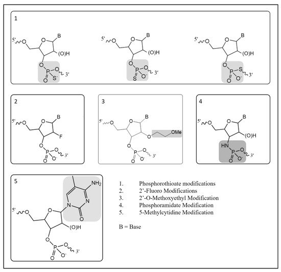There are three main types of approaches used to manipulate the genome in gene doping: gene silencing, gene transfer, and gene editing [2]. Many gene-silencing technologies utilize heavily modified versions of RNA to interfere with gene expression and these modifications are performed to improve the stability, pharmacokinetics, pharmacodynamics, and target sequence recognition functionality [3]. Due to the rapid degradation of RNA molecules in biological matrices, synthetic modifications have been made with the aim of increasing stability by increasing resistance to exo- or endonucleases. In turn, the presence of more than ten phosphorothioate modifications in an oligonucleotide result in decreased nuclease activities, allowing the molecule to reach their targets without significant degradation [4]. Further modifications have been developed to improve pharmacokinetics and pharmacodynamics. The five of the most common oligonucleotide modifications include phosphorothioate, 2′-fluoro, 2′-O-methoxyethyl, phosphoramidate, and 5-methylcytidine (Figure 1) [4,5]. While there are several non-natural modifications that have been developed, the use of phosphorothioate modifications is commonly found in most antisense oligonucleotides (ASOs) and small interfering RNA (siRNA) molecules under development. Because the phosphorothioate modification is not naturally occurring in high abundance, this creates an opportunity to develop methodologies capable of detecting their presence in biological matrices for racehorses and other performance athletes where the use of these technologies is prohibited.