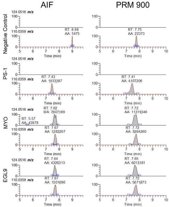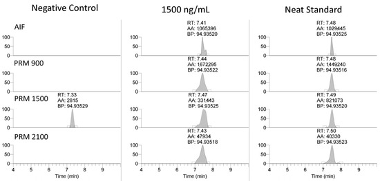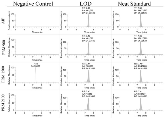 Representative extracted ion chromatograms of 94.935 m/z product ion using AIF and PRM scan modes in negative control serum, spiked serum at the limit of detection, and a neat standard.
